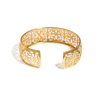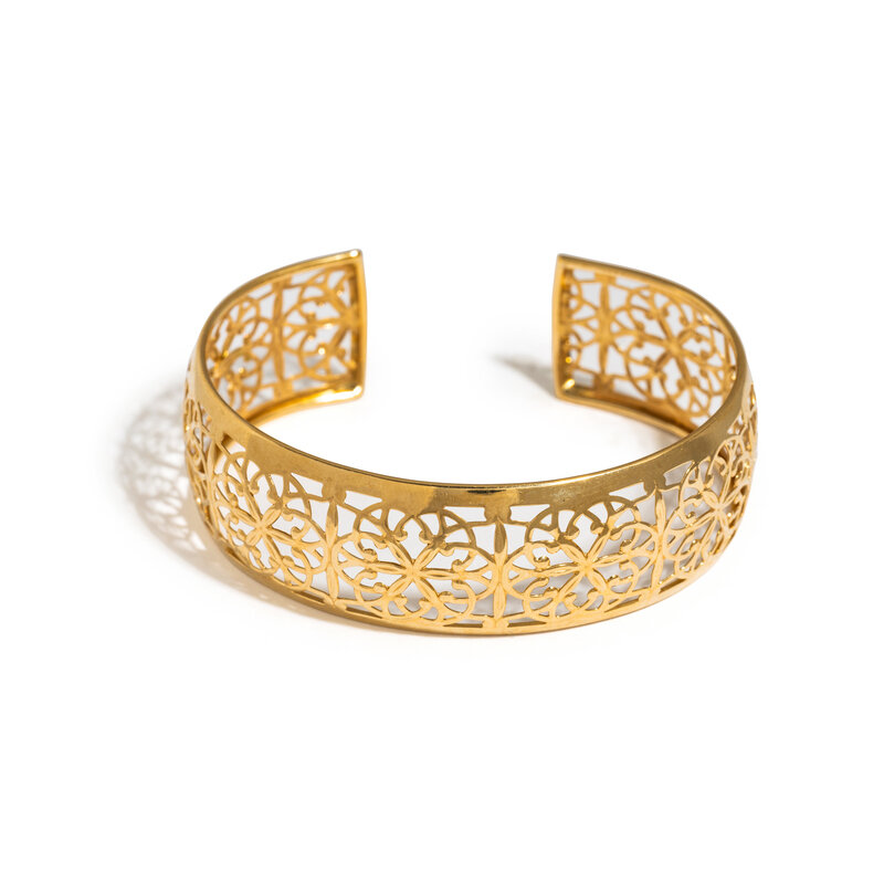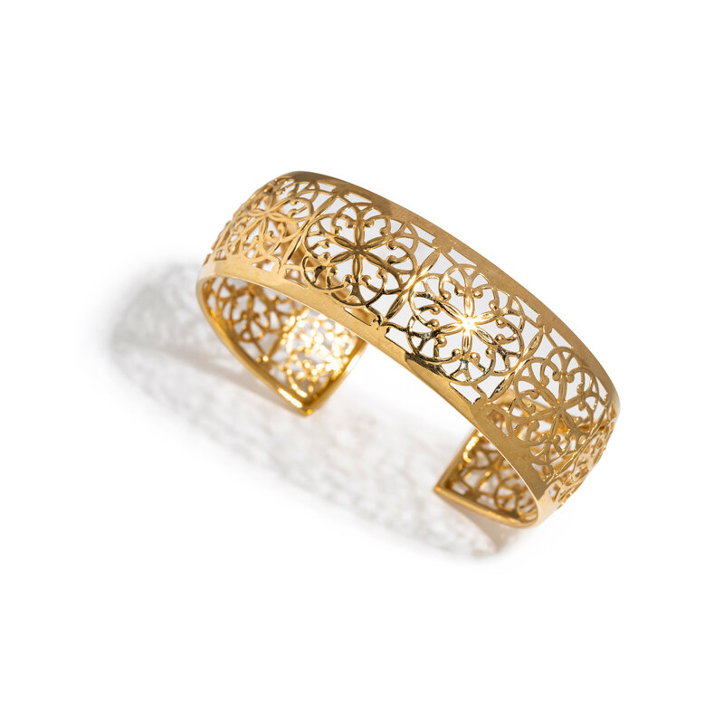 14 karat yellow gold. 7 inches inner circumference, 3/4 inch wide.