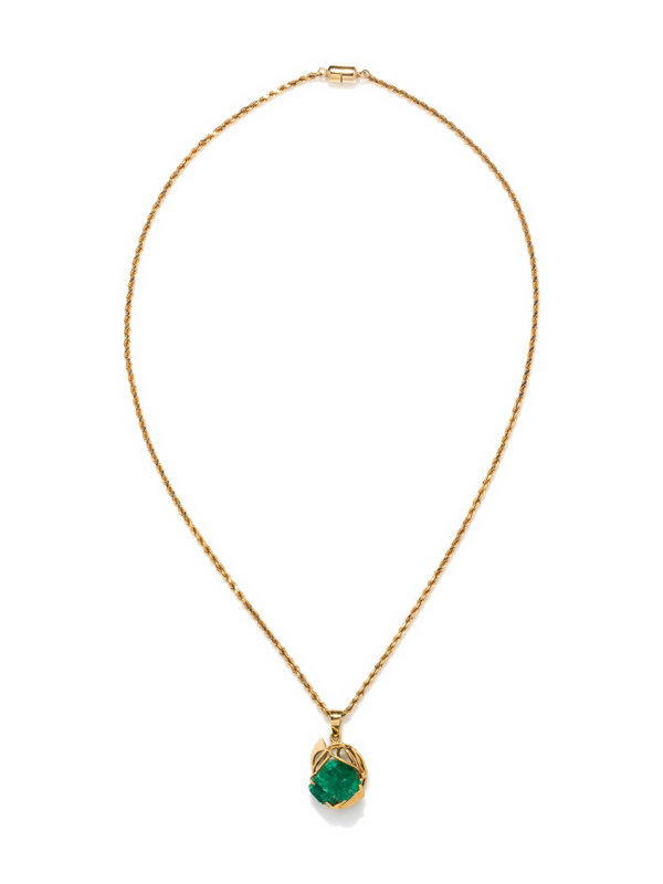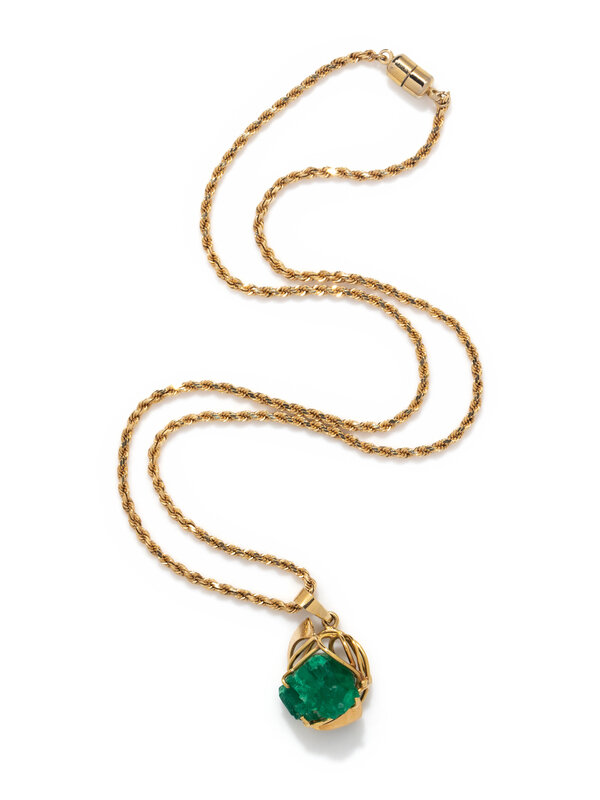 Rough emerald crystal measuring approximately 18.00 x 15.00 x 13.00 mm, mounted in yellow gold, suspended from a rope link chain. Chain: 24 3/4 inches long. Pendant: 1 inch long.