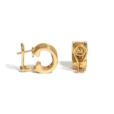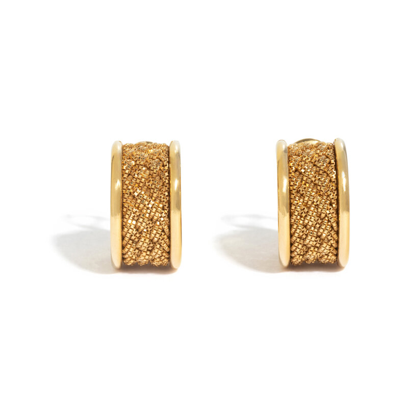 Woven half-hoops measuring approximately 8.00 mm wide, posts with clip backs. 18 karat yellow gold. 1/2 inch long.