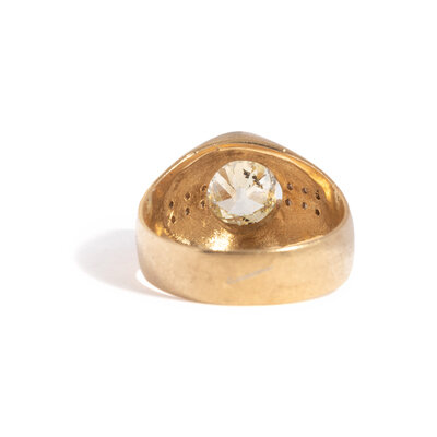 One oval antique oval cut diamond weighing approximately 2.00 carats and single cut diamonds. 14 karat yellow gold. Ring size 10 1/2.