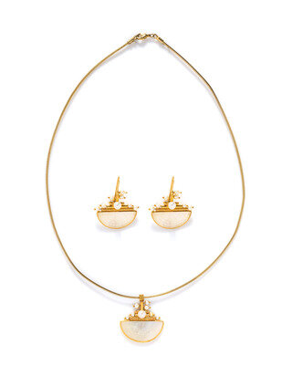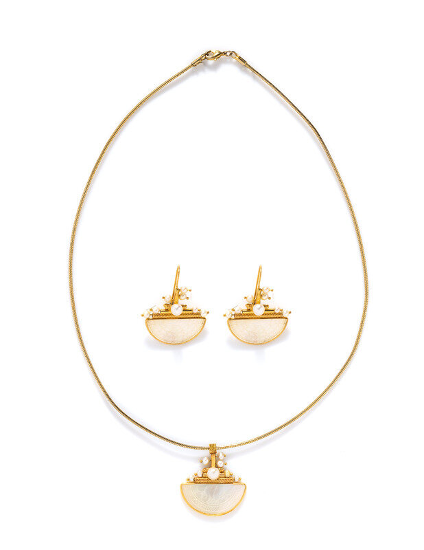 Including a pair of earrings and pendant on a non-gold snake chain.