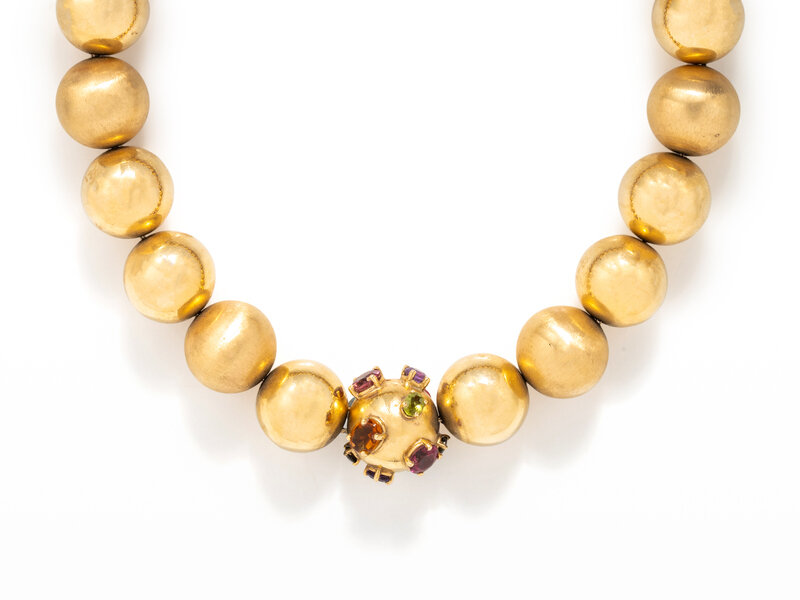 Textured and smooth yellow gold beads measuring approximately 19.00 mm each, central bead set with variously shaped gemstones including citrine, pink tourmaline, green tourmaline, peridot and quartz. 15 ½ inches long.