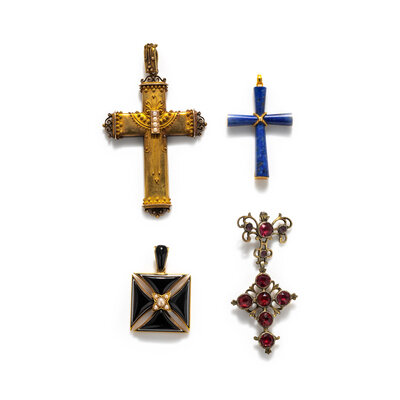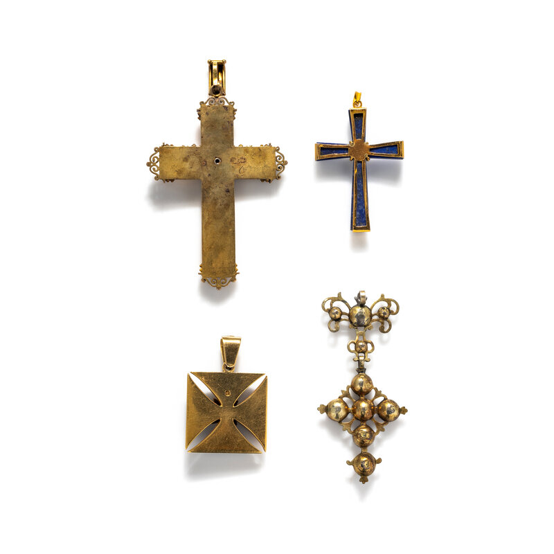 Including a lapis lazuli cross, an agate and seed pearl Maltese cross, a gilt red paste cross, and a textured hollow gold gross with seed pearl accents. Yellow gold. 1 7/8 x 1 5/16 inches, 1 ¾ x 1 3/16 inches, 2 ¾ x 1 5/16 inches, and 3 ½ x 2 1/8 inches.