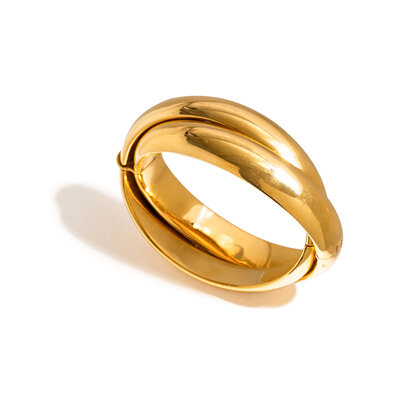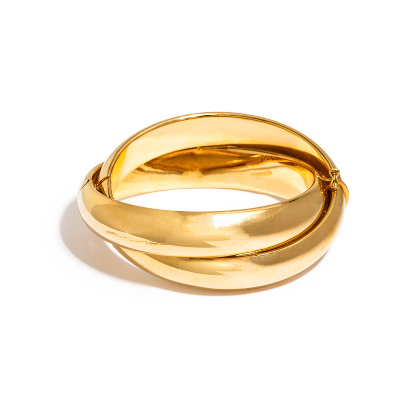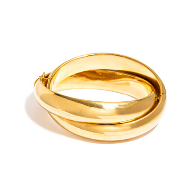 Hinged with side clasp. 7 inches inner circumference, 1 inch wide.