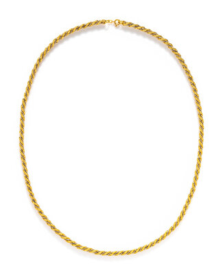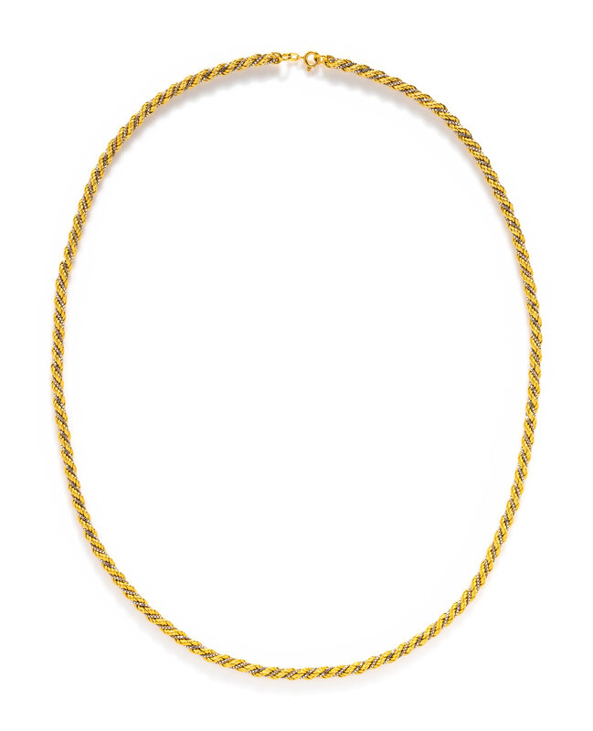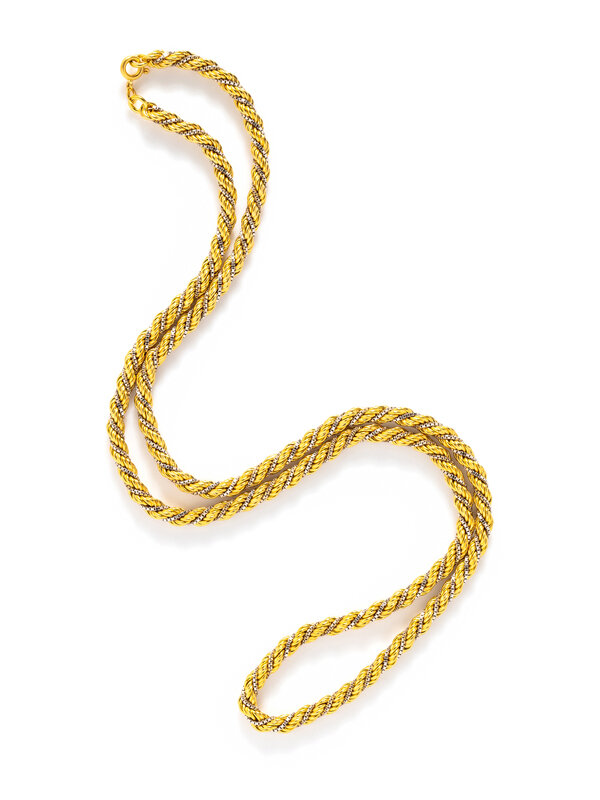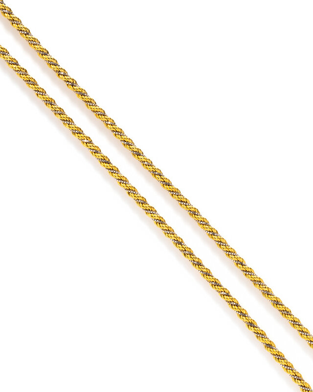 Yellow gold rope chain twisted together with white gold box chain. 28 inches long.