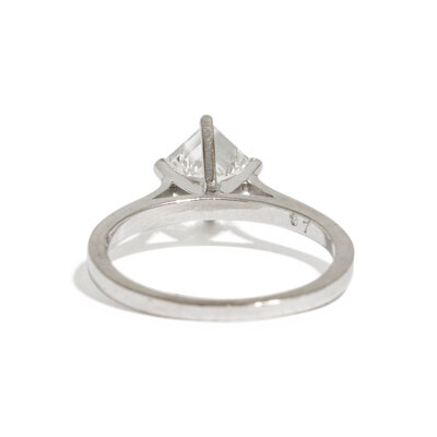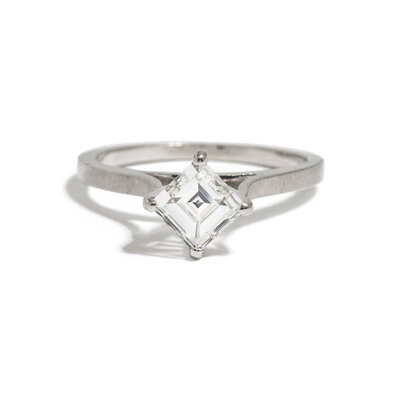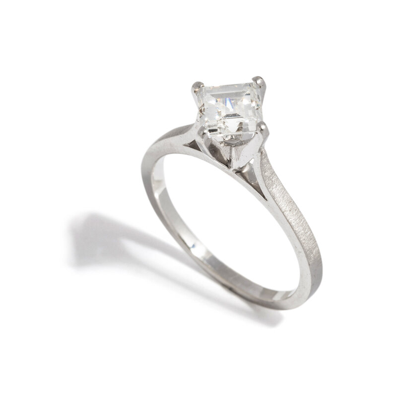Square step cut diamond weighing approximately 0.95 carat. 14 karat white gold. Ring size 6.