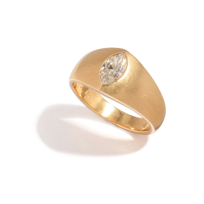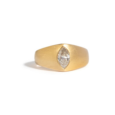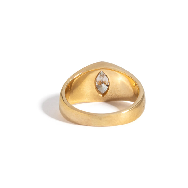 Marquise cut diamond weighing approximately 0.50 carat. 18 karat yellow gold. Ring size 6 1/2.