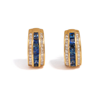 Princess cut diamonds weighing approximately 1.90 carats total and square mixed cut sapphires. 18 karat yellow gold. 3/4 inch long.