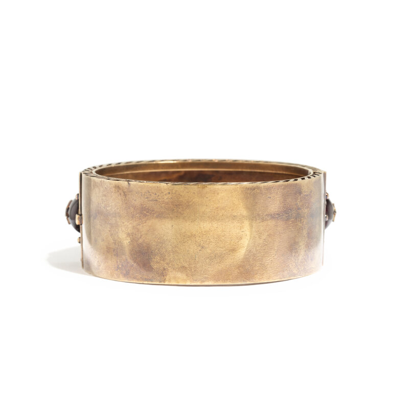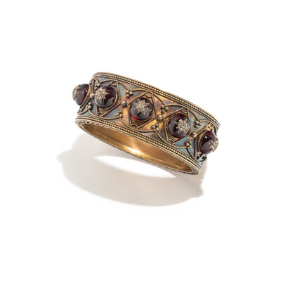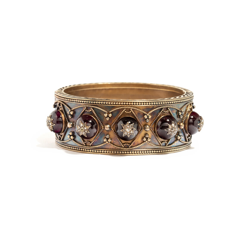 VICTORIAN, YELLOW GOLD, CARBUNCLE GARNET AND DIAMOND BANGLE BRACELET