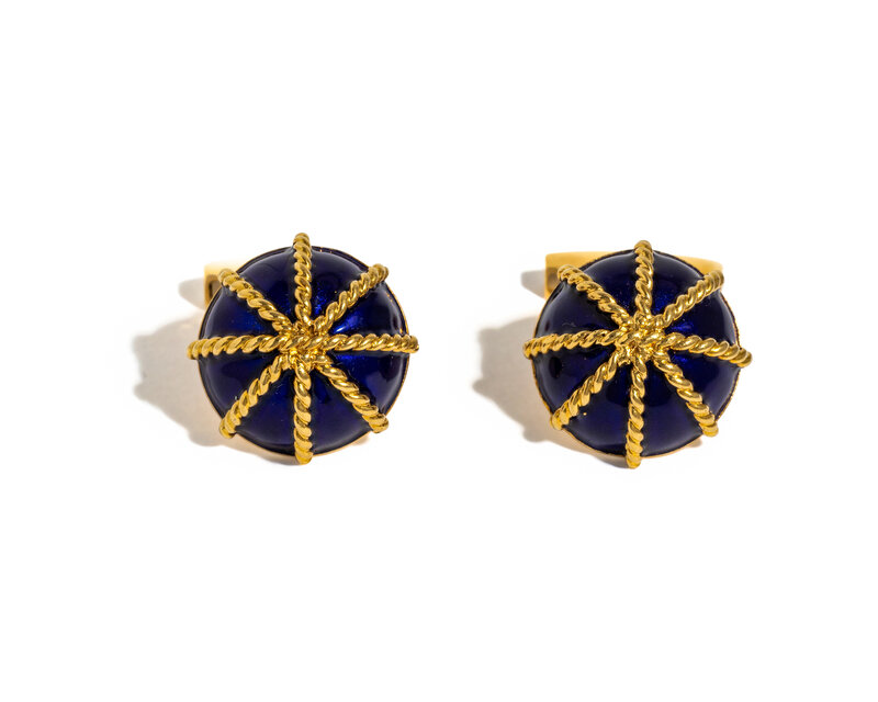 Blue enamel and 18 karat yellow gold. 3/4 inch wide terminals.