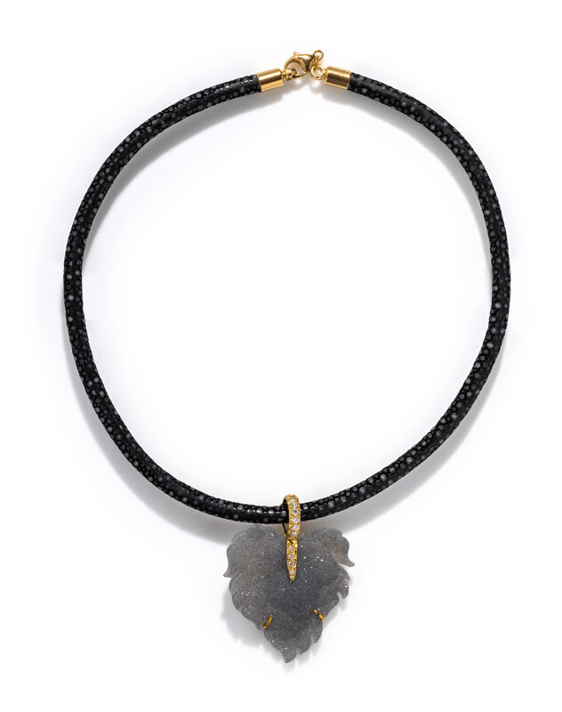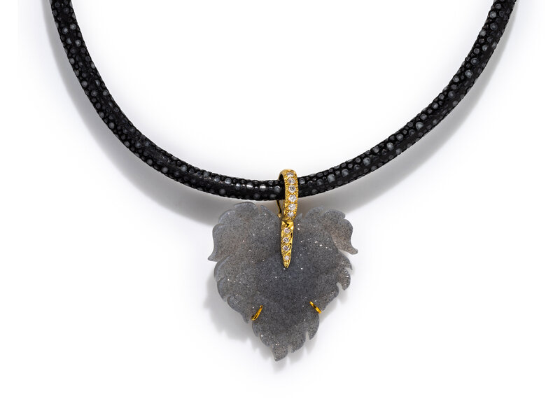 Carved leaf druzy agate and round brilliant cut diamonds, suspended from a shagreen collar. 18 karat yellow gold. 16 inches long. Pendant: 2 x 1 1/2 inches.