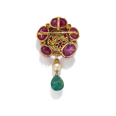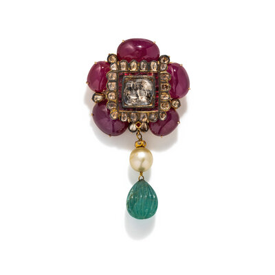 Cabochon and rectangular cut glass-filled rubies, carved emerald, cultured South Sea pearl and rose cut diamonds, with polychrome enameling. Silver-topped yellow gold. 4 x 2 1/4 inches.