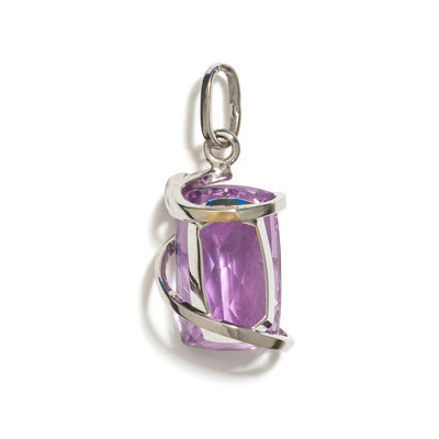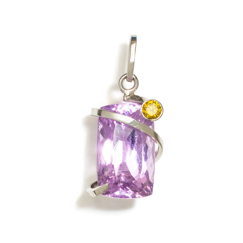 Modified rectangular cushion cut kunzite measuring approximately 20.00 x 12.50 x 11.60 mm, round brilliant cut irradiated green-yellow diamond (origin of color not tested) measuring approximately 4.20 mm. White gold. 1 inch long.