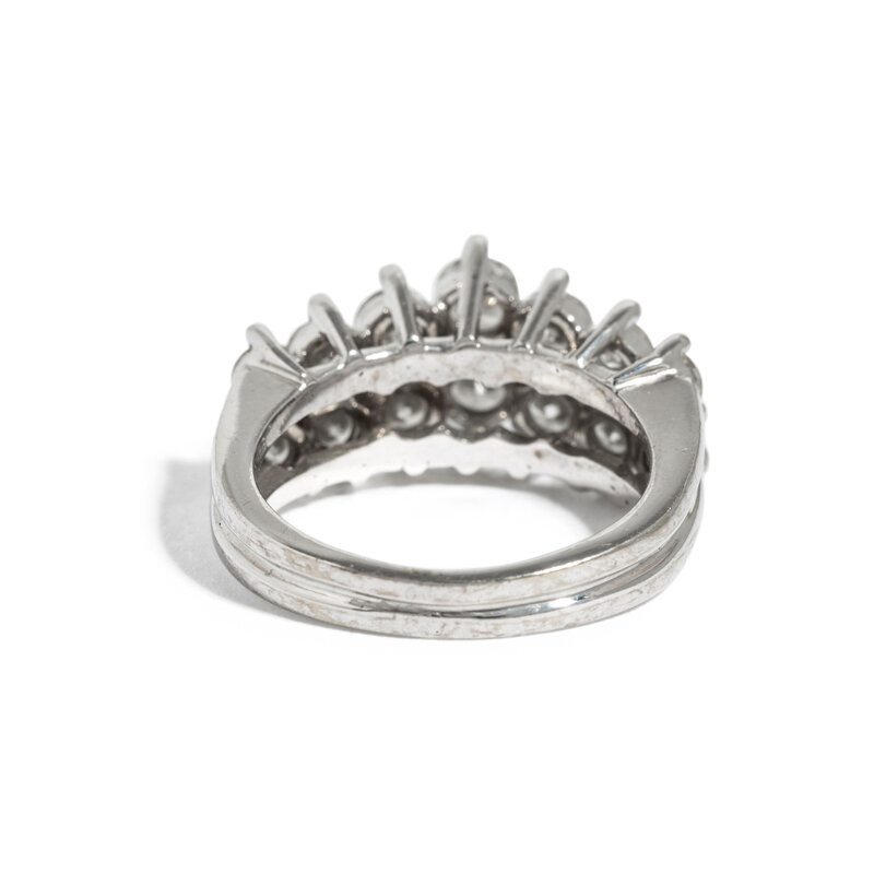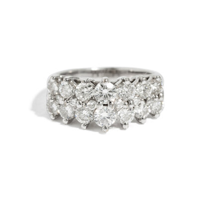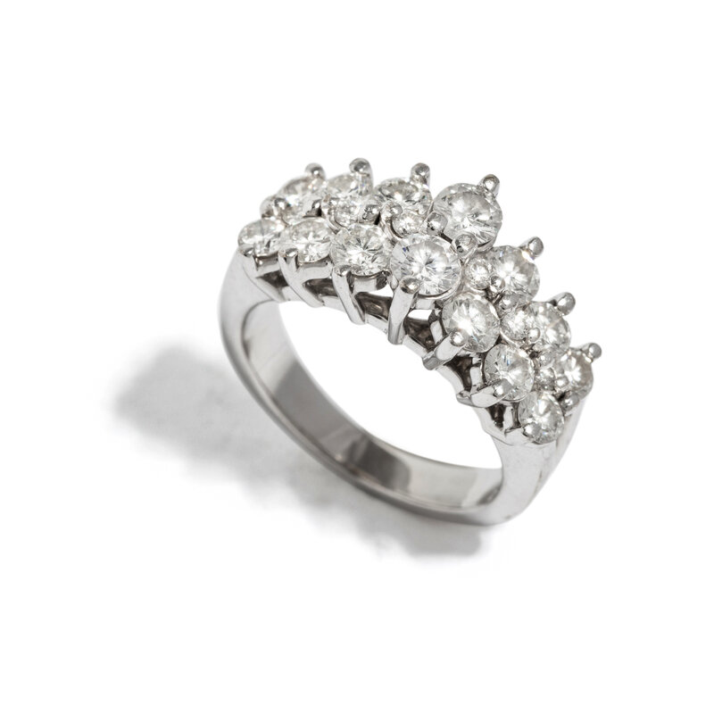 Round brilliant cut diamonds weighing approximately 1.85 carats total. 14 karat white gold. Ring size 5.