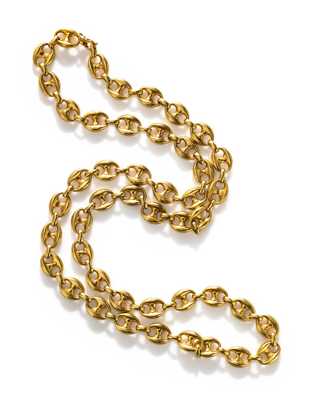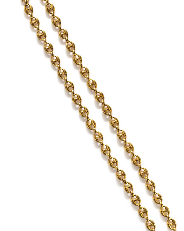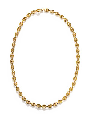 Puffed mariner link chain. 14 karat yellow gold. 31 inches long.