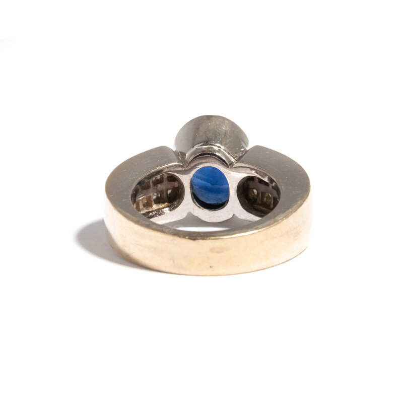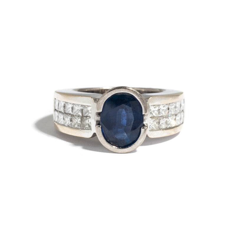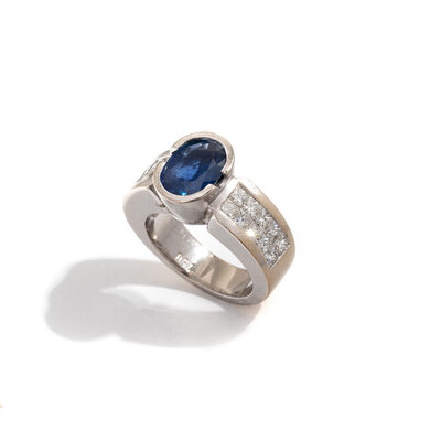 Oval mixed cut sapphire measuring approximately 9.35 x 7.00 x 3.75 mm and 20 princess cut diamonds weighing approximately 1.40 carats total. 18 karat white gold. Ring size 4.