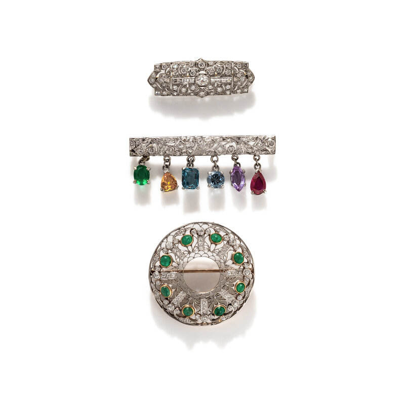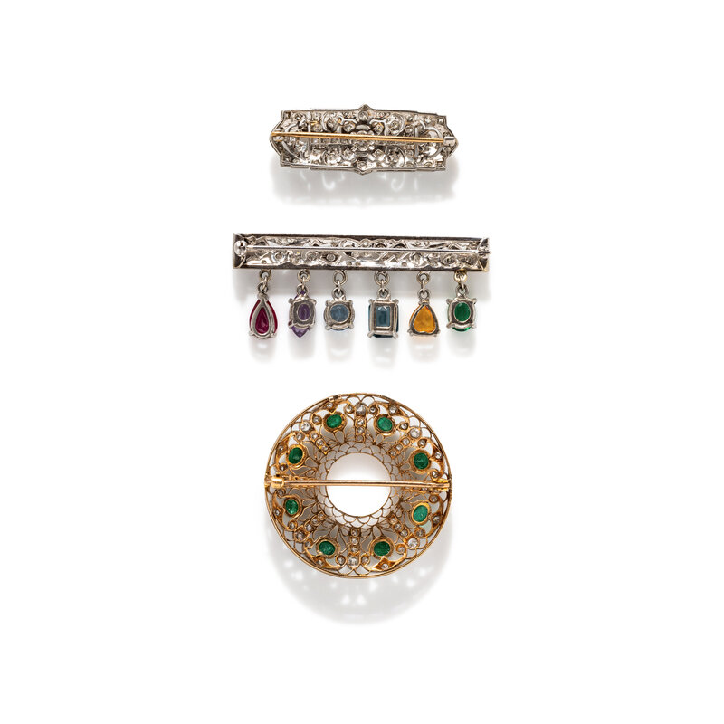 Circle brooch set with oval cabochon emeralds and old European cut diamonds weighing approximately 1.15 carats total, a brooch set with round brilliant cut, single cut, and princess cut diamonds weighing approximately 1.75 carats, and a brooch set with single cut and round brilliant cut diamonds weighing approximately 0.65 carat total, with a fringe of variously cut green glass, yellow sapphire, blue topaz, purple sapphire, and ruby. Platinum and 14 karat gold. 1 5/8 inches, 1 5/8 inches, and 2 ¼ inches long.