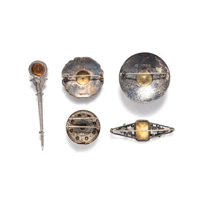 Three round textured brooches each set with round cut citrine measuring approximately 10.00 mm, 15.00 mm, and 19.00 mm respectively, a bar pin with a round cut citrine measuring approximately 14.00 mm, and a brooch set with an emerald cut citrine measuring approximately 12.10 x 16.00 mm. 1 3/16 inches, 1 7/16 inches, 1 ¾ inches, 3 1/8 inches, and 2 ¼ inches long.