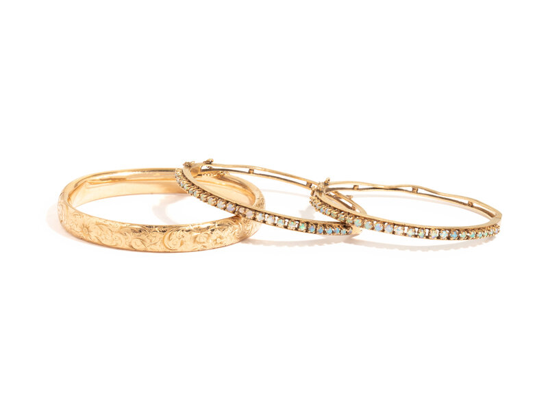 Including a hollow textured yellow gold bangle with floral motif, and a pair of matching bracelets set with round cut opals. 14 karat yellow gold. Inner Circumferences: 7 inches and 6 ½ inches.