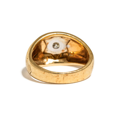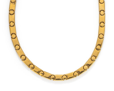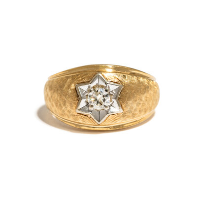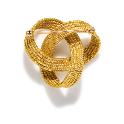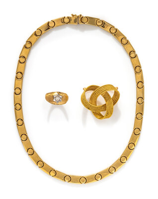 Textured knot brooch, a high polish flat link necklace, and a ring set with a round brilliant cut diamond weighing approximately 0.25 carat. 18 karat and 14 karat yellow gold. Brooch: 1 3/8 inches wide. Necklace: 16 ¼ inches long. Ring Size: 6 ¾.