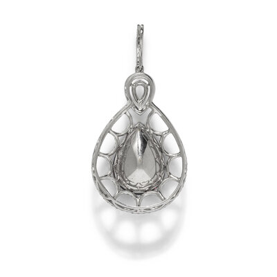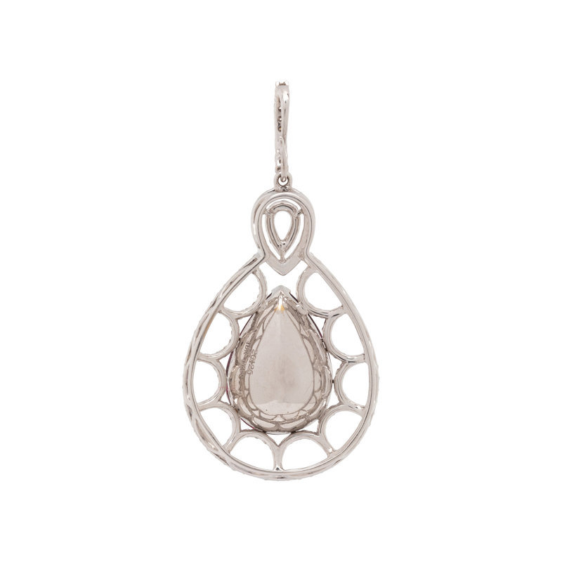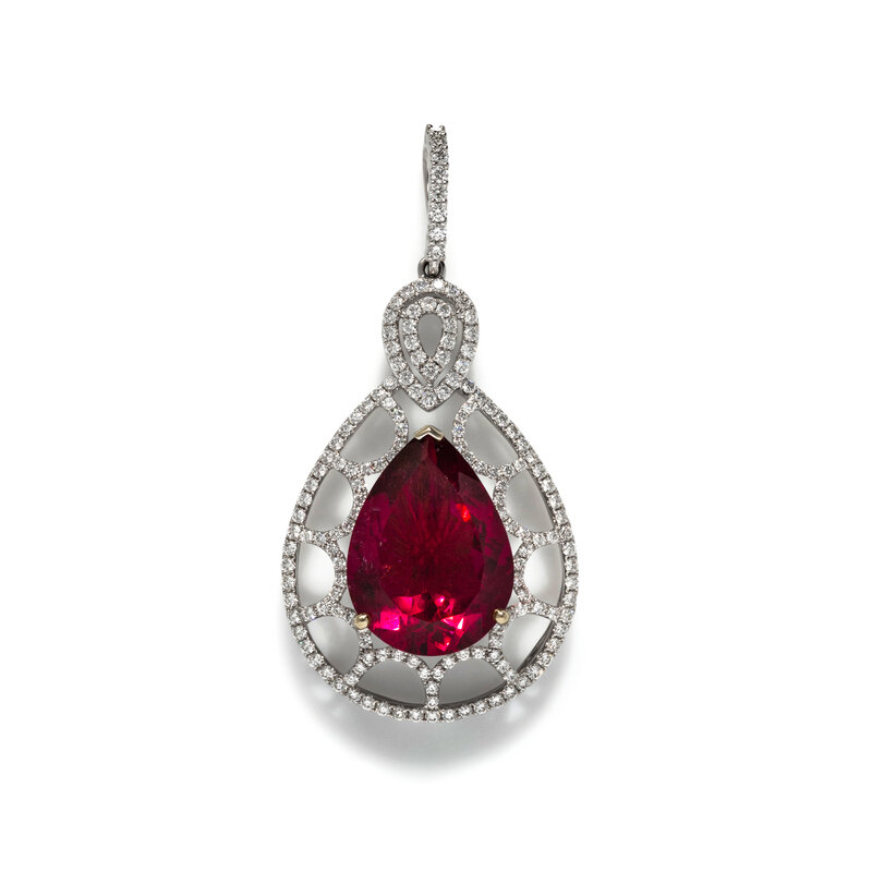 Pear shaped rubellite tourmaline measuring approximately 20.35 x 15.10 mm and numerous round brilliant cut diamonds weighing approximately 1.25 carats total. 18 karat white gold. 2 inches long.