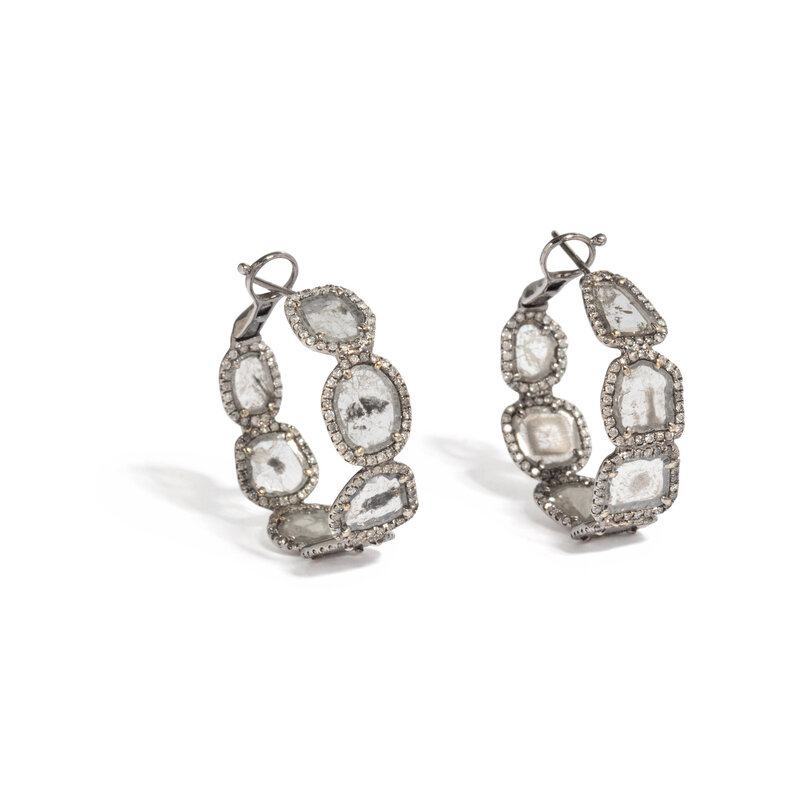 Asymmetrical diamond slices, with round brilliant cut diamond surround weighing approximately 1.50 carats total. 1 1/8 inches long.