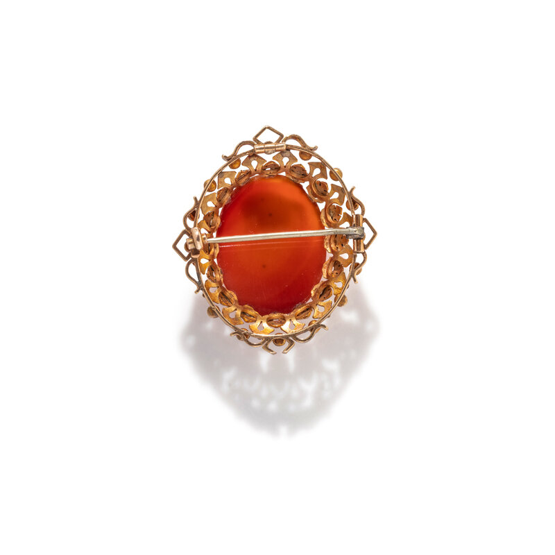 Hardstone cameo measuring approximately 25.00 x 20.00 mm. Rose and yellow gold. 1 1/2 x 1 1/2 inches.