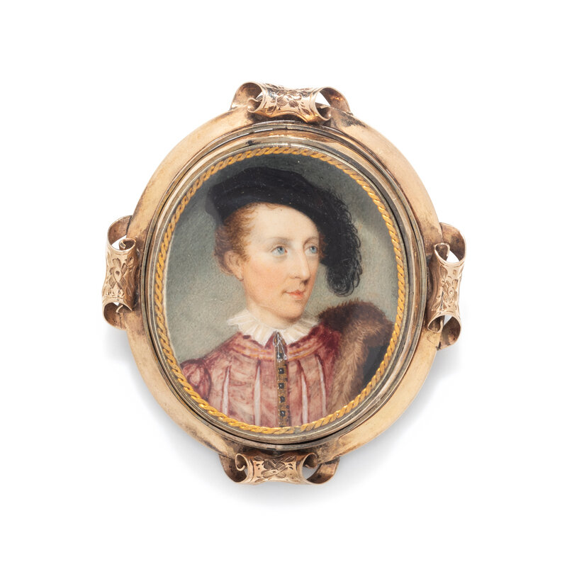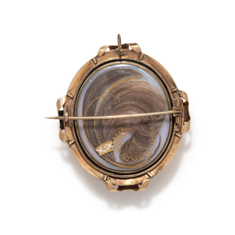 Portrait brooch with hair memento and seed pearl accents on reverse. Center can be spun to display either side. Yellow gold. 2 ¼ x 2 inches.