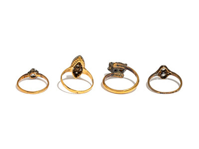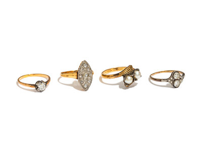 Pearl ring (origin not tested), a solitaire diamond ring, a ring set with single cut and rose cut diamonds, and a ring set with old European cut and rose cut diamonds. Diamonds weigh approximately 1.00 carat total. Ring Sizes: 8, 6, 7, and 7.