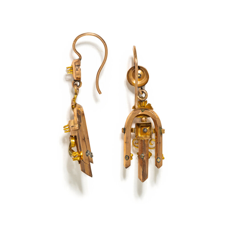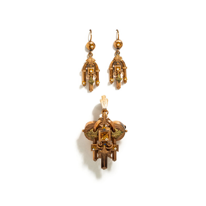 Pendant/brooch and earrings, with seed pearls and round mixed cut sapphires. Rose and yellow gold. Brooch: 2 3/4 x 1 1/2 inches, Earrings: 2 inches long.
