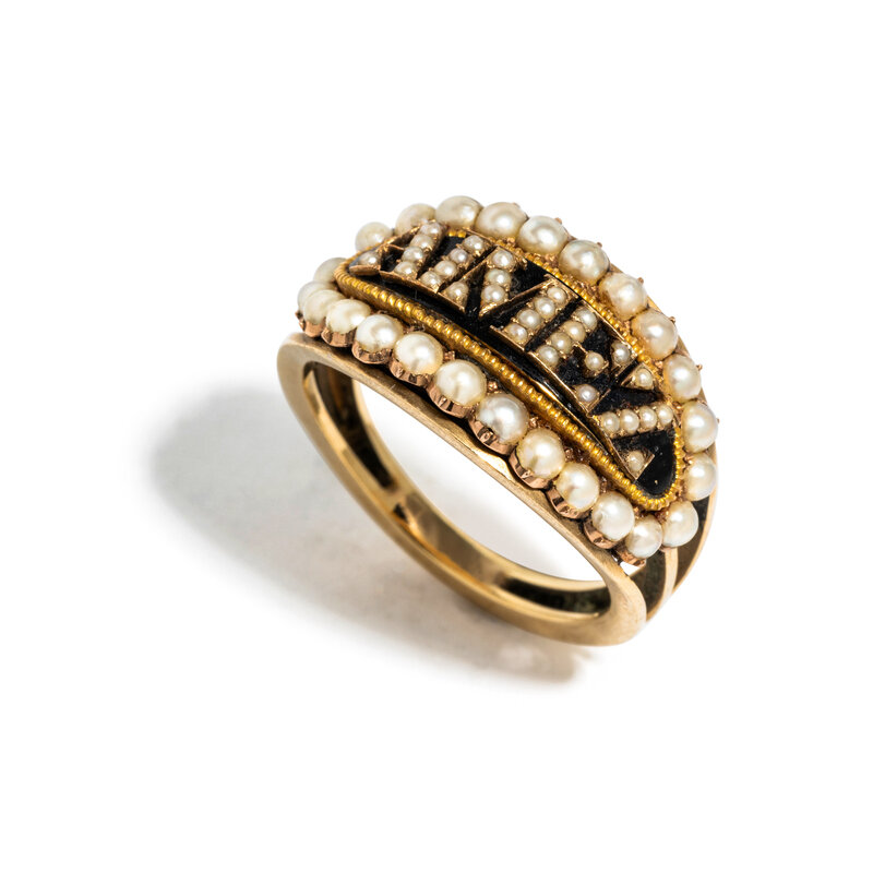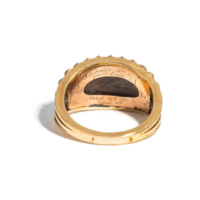 Seed pearls and onyx, with braided memento hair in undercarriage. Yellow gold. Ring size 6 3/4.