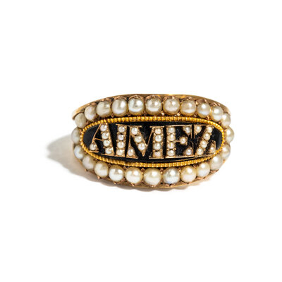 VICTORIAN, 'AIMEZ' ONYX AND SEED PEARL RING