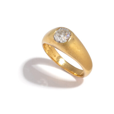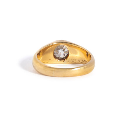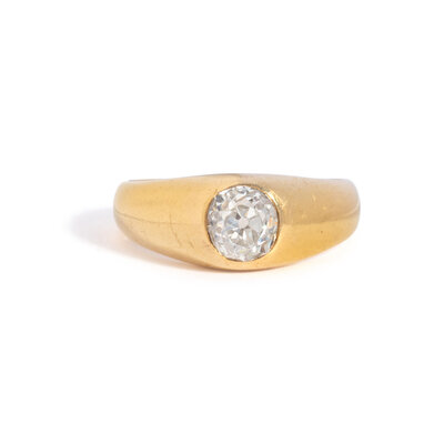 Old European cut diamond weighing approximately 0.90 carat. 18 karat yellow gold. Ring size 6.