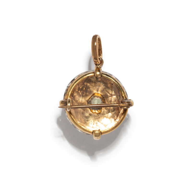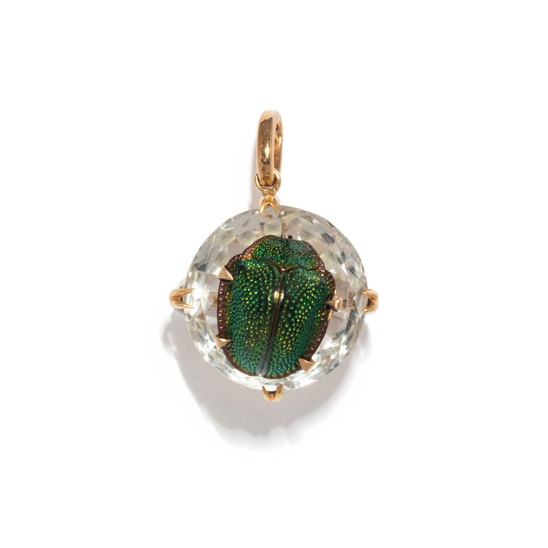 Round faceted rock crystal surmounted with a scarab shell. Yellow gold. 3/4 inch wide.