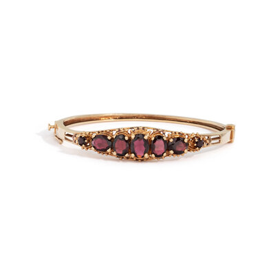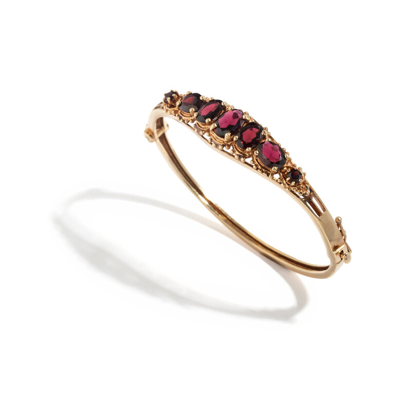 Oval and round mixed cut garnets, hinged with side clasp. 14 karat yellow gold. 6 1/2 inches inner circumference.