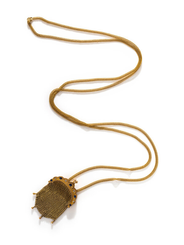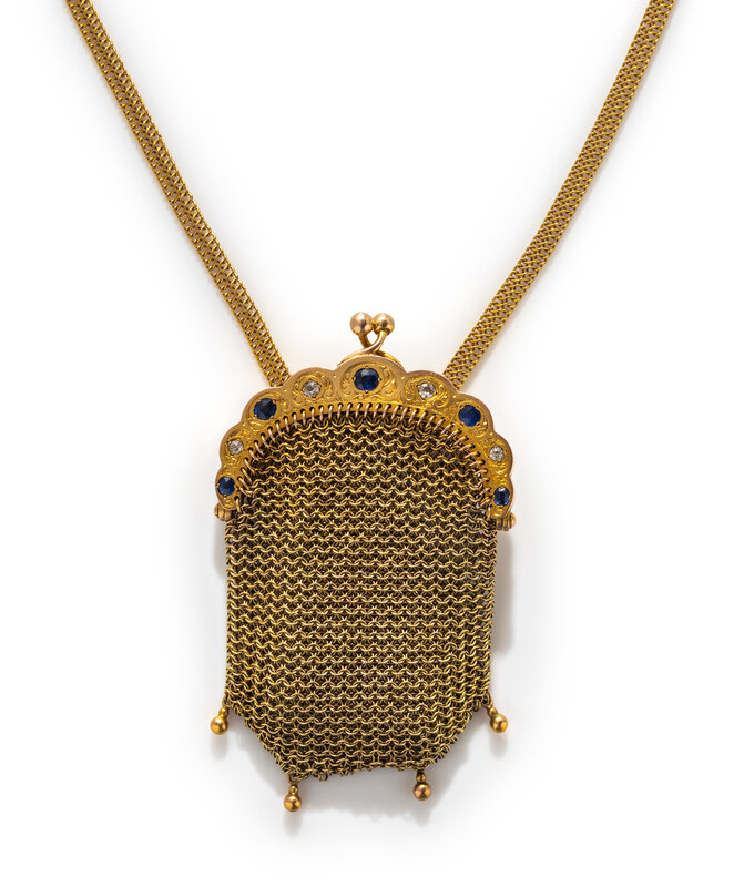 ANTIQUE, YELLOW GOLD, SAPPHIRE AND DIAMOND MESH PURSE AND CHAIN