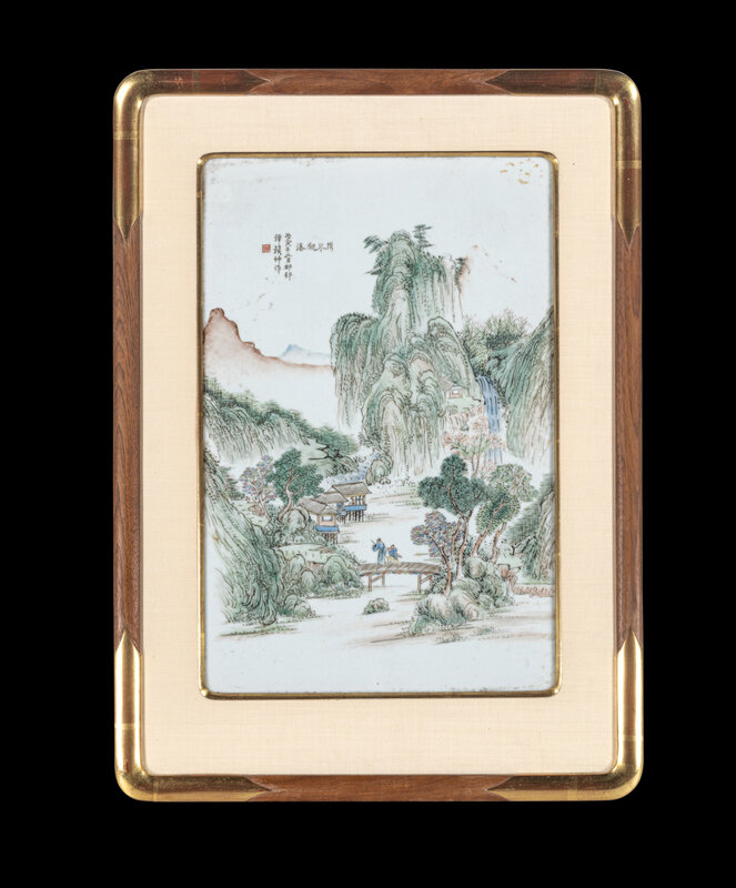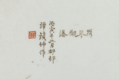 譚振坤丙寅年(1926)製携琴觀瀑圖瓷板