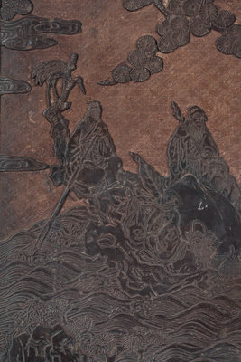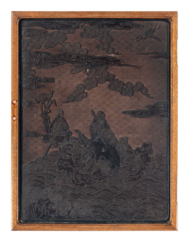 carved to the deeply toned lacquer set with a brown lozenge ground to show various Daoist immortals gathering to cross turbulent waves.