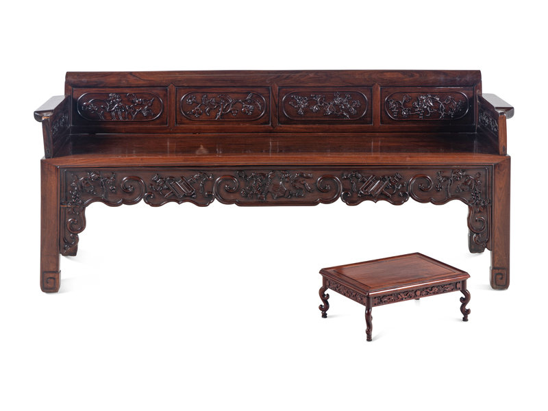 the rectangular back panel divided into four sections each carved in relief with a cartouche enclosing lotus, pomegranates, peonies and grapes, the sides carved with pomegranates, prunus blossoms and peach branches topped with wide armrests, the single-paneled seat above a shaped apron and frieze carved to show large ruyi-heads enclosing auspicious emblems, all supported on square section legs ending in hoof feet; together with a carved hardwood kang table.