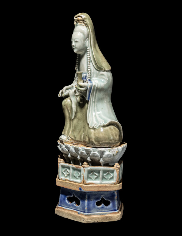 depicted glad in draped robes and jewels glazed in mossy and clear green hues above a carved, molded, and reticulated lotus pedestal base, the left hand holding a small bottle vase aloft.