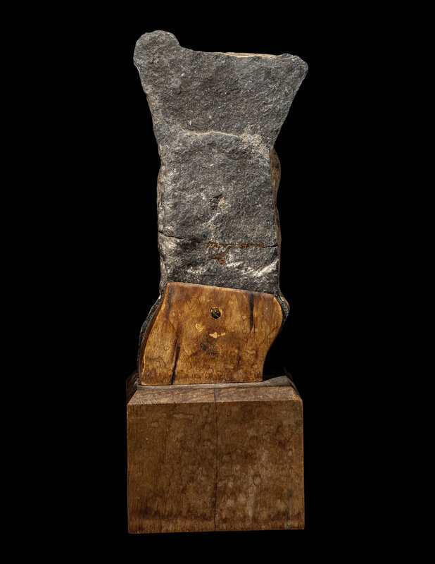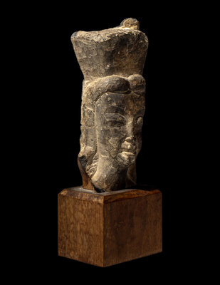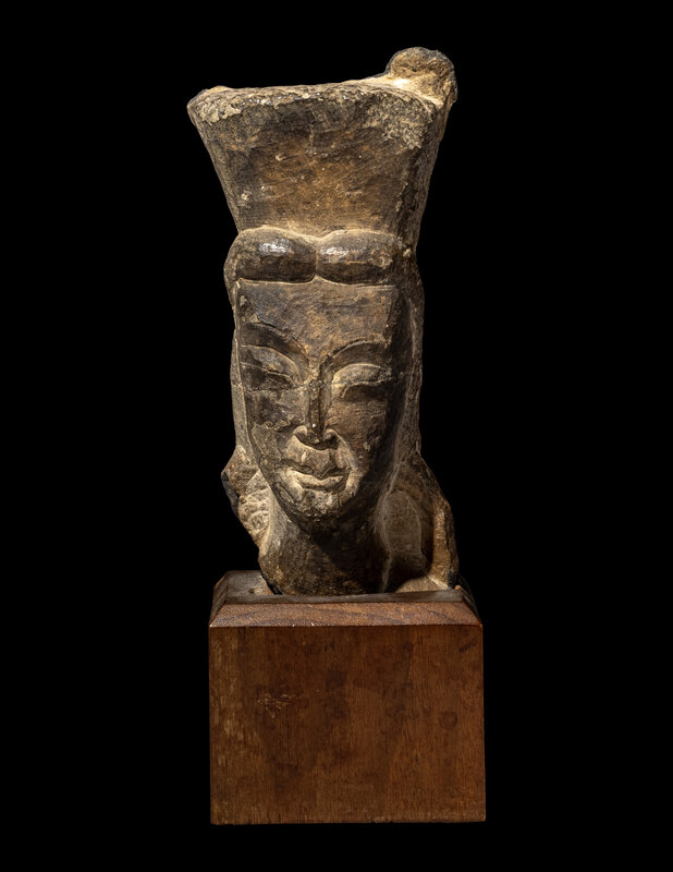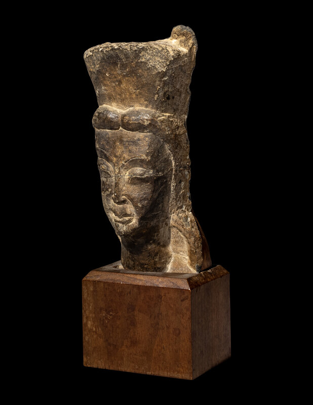 the face carved with a calm expression showing a pair of arched eyebrows above downcast eyes, a straight nose and full lips, topped with a tall crown, raised on a later hardwood stand.