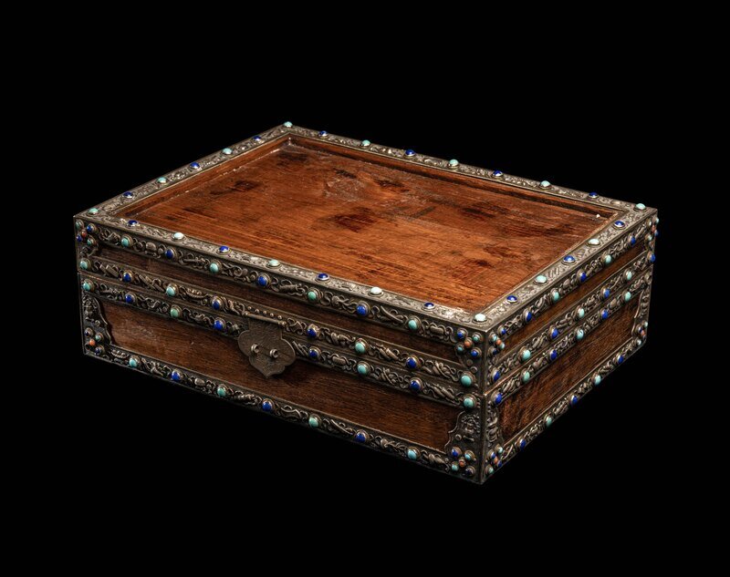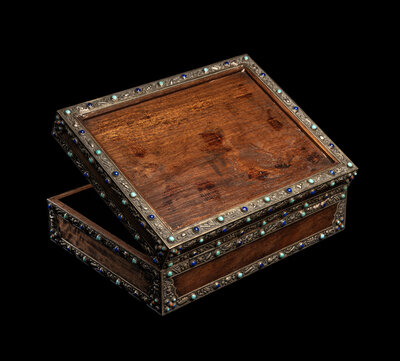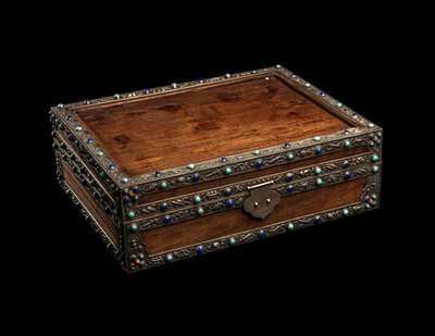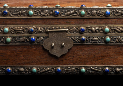 of rectangular form, the corners, top and lower edges of the box and cover each mounted with hardstone-inset silver bands chased with auspicious symbols. The back mounted with a simple hinge opposite the central front lockplate.