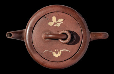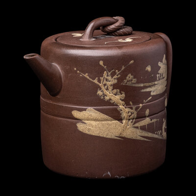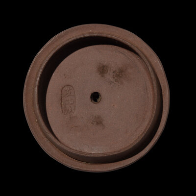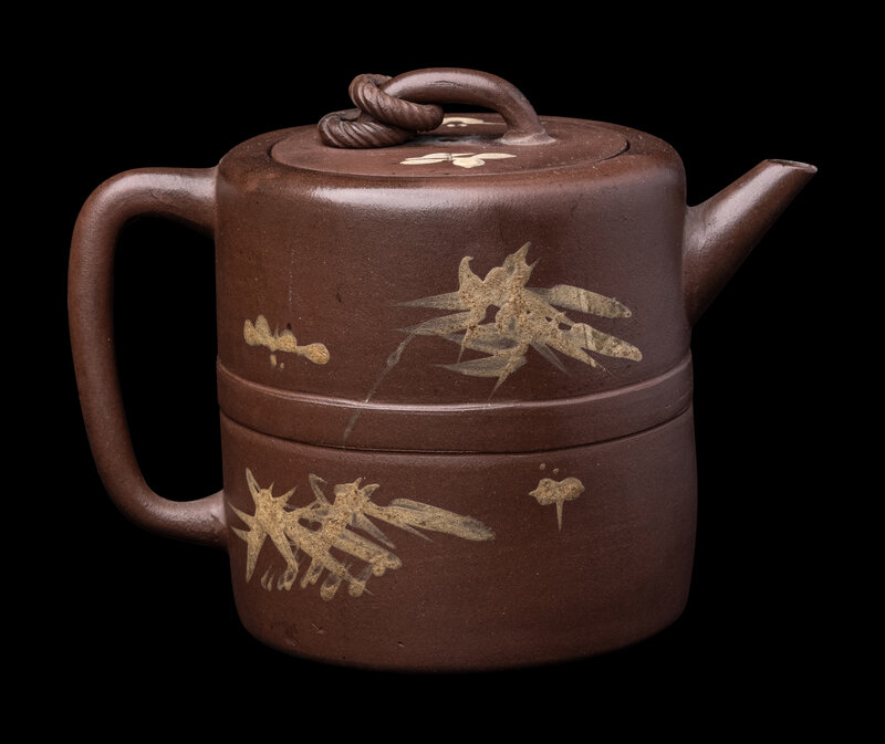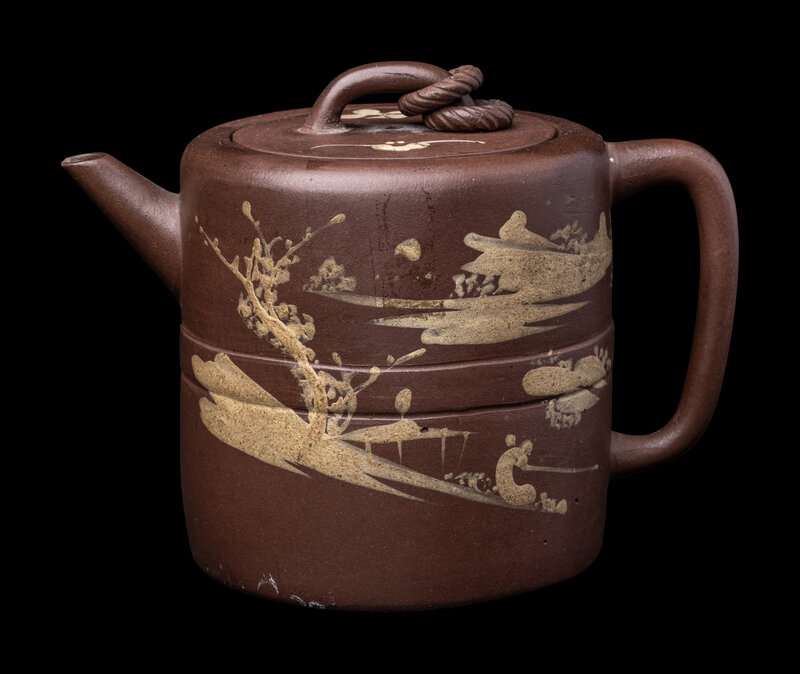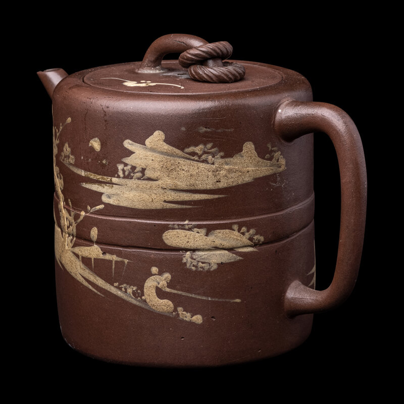 the cylindrical body decorated with a stylized landscape and incised with a double band, the cover molded with twisted rope hoops, the underside of the cover with an oval impressed seal Youlan.