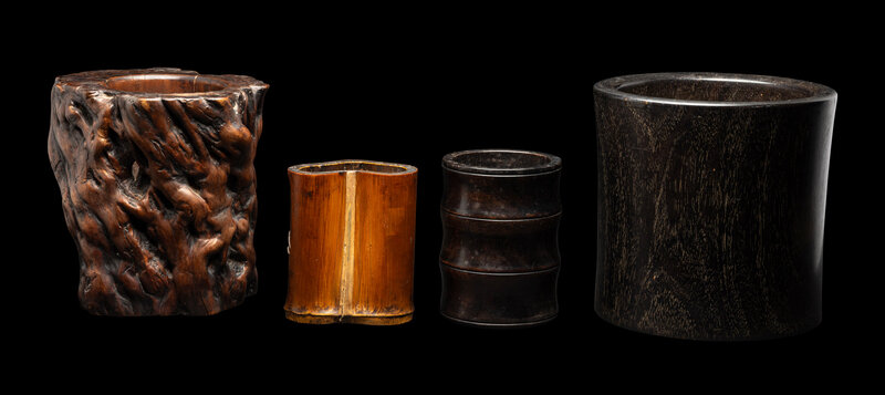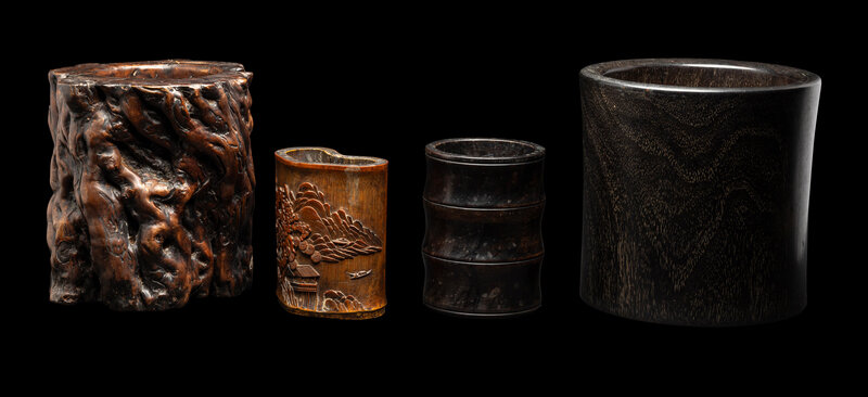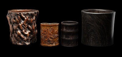 comprising three hardwood examples, the first of naturalistic root-from, the second carved as a stalk of bamboo, the third of plain cylindrical form with compressed sides; on of bamboo carved with a continuous landscape between beaded bands at the foot and mouth.
