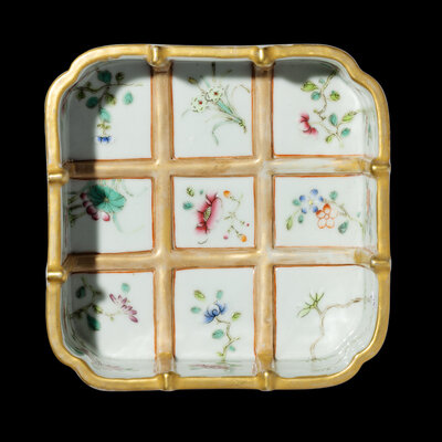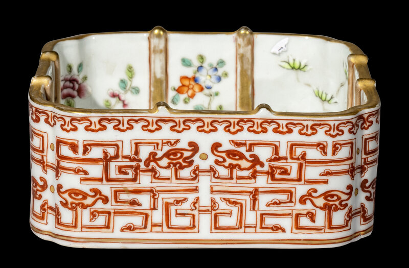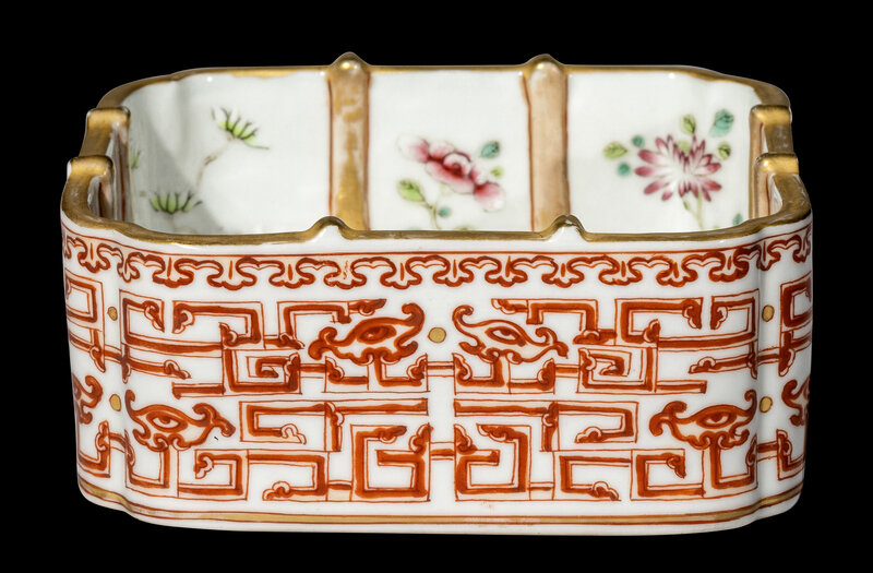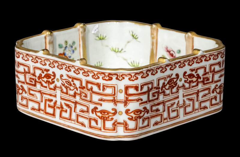of square form with indented corners, the exterior decorated in iron-red with archaistic dragon scrolls and masks, the interior molded with gilt crisscrossing bands dividing various famille rose enameled flowers.