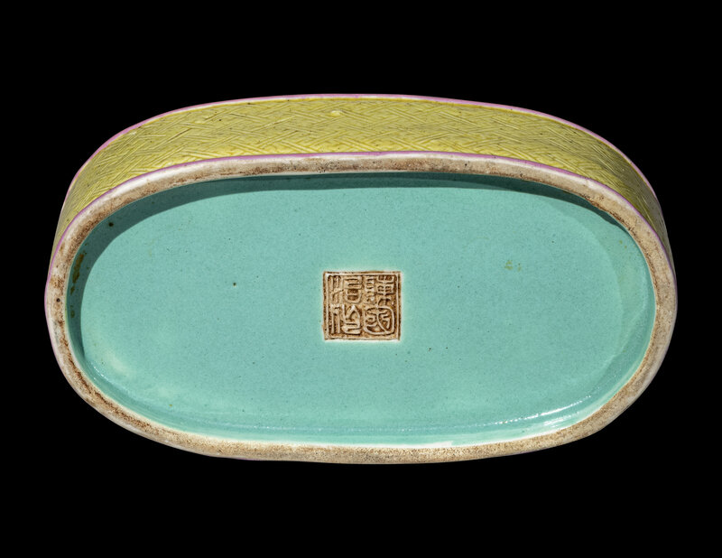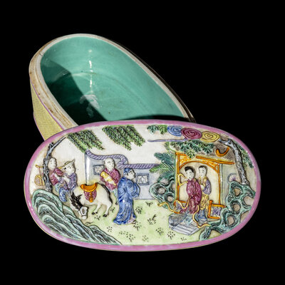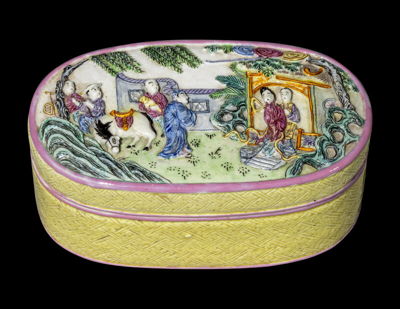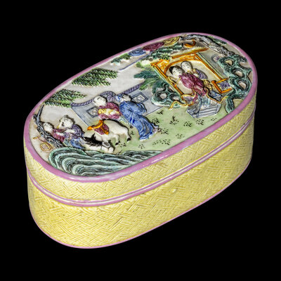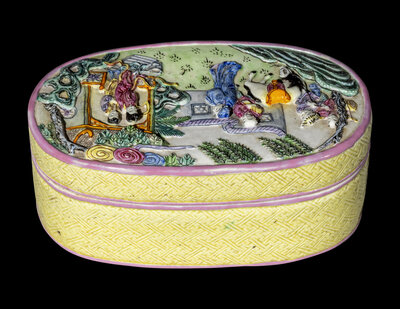 of squared oval shape, the box and conforming covered incised with a basketweave pattern and enameled yellow with a pink outline at the rims, the top painted and molded with figures, the underside, and interior glazed turquoise.