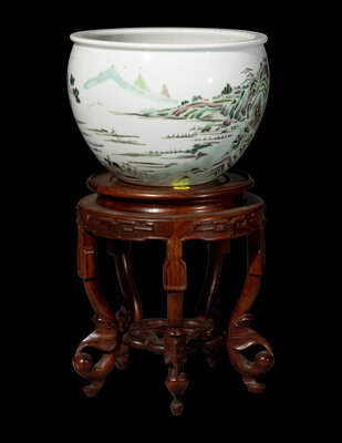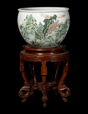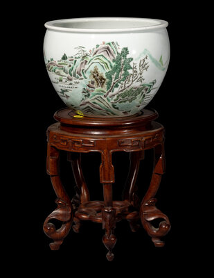 the domical bulbous body rising to to lipped mouth rim, painted with shaggy cliffs and verdant pines in a continuous landscape, together with a rosewood stand.