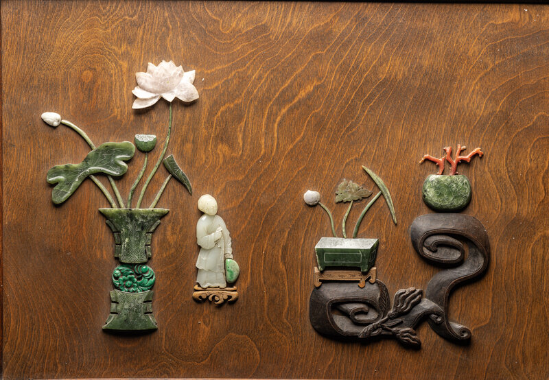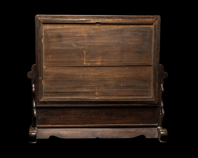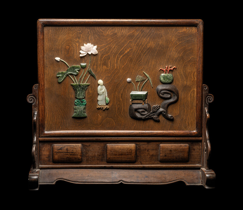 having and elmwood panel set within a beaded framed, nestled in an easel stand carved with cloud scrolls, inlaid to one side with intricate jades and hardstones depicting scholar's objects.