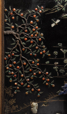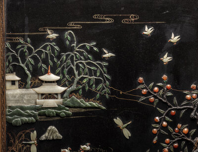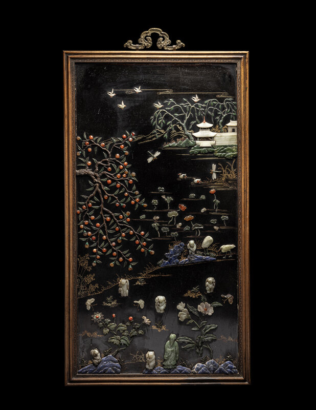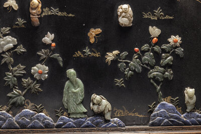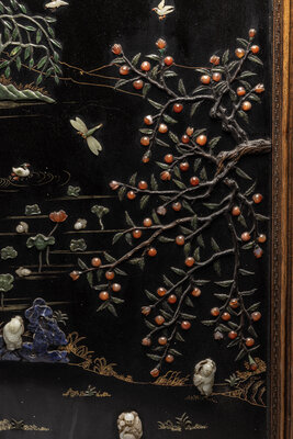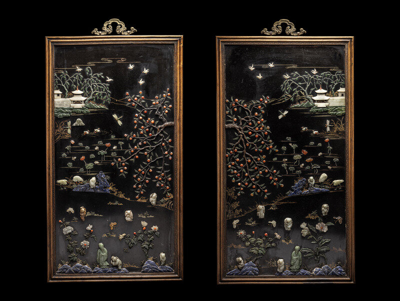 A Pair of Chinese Black Lacquered Hardstone Inset Rectangular Wall Panels