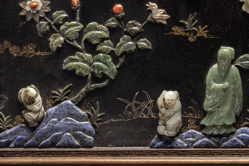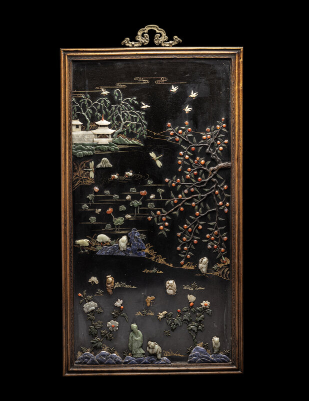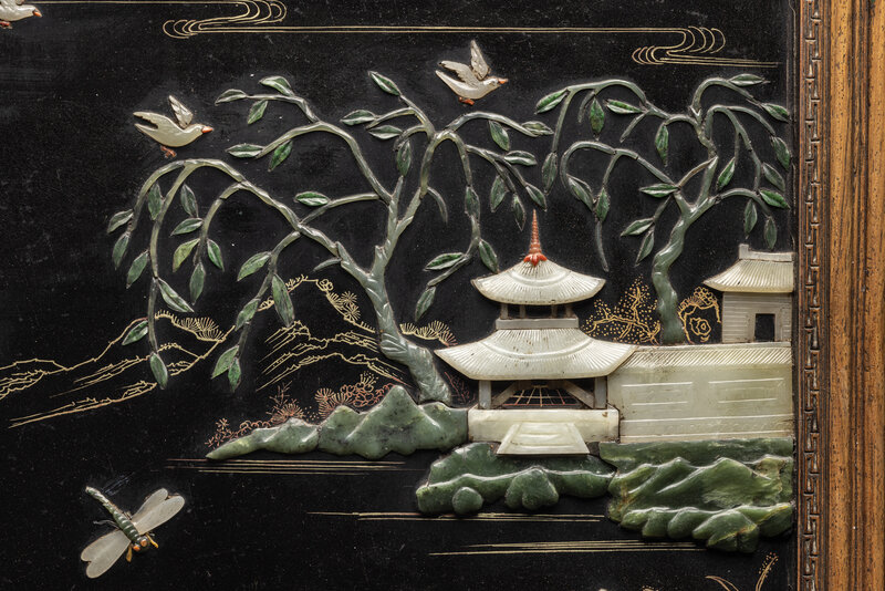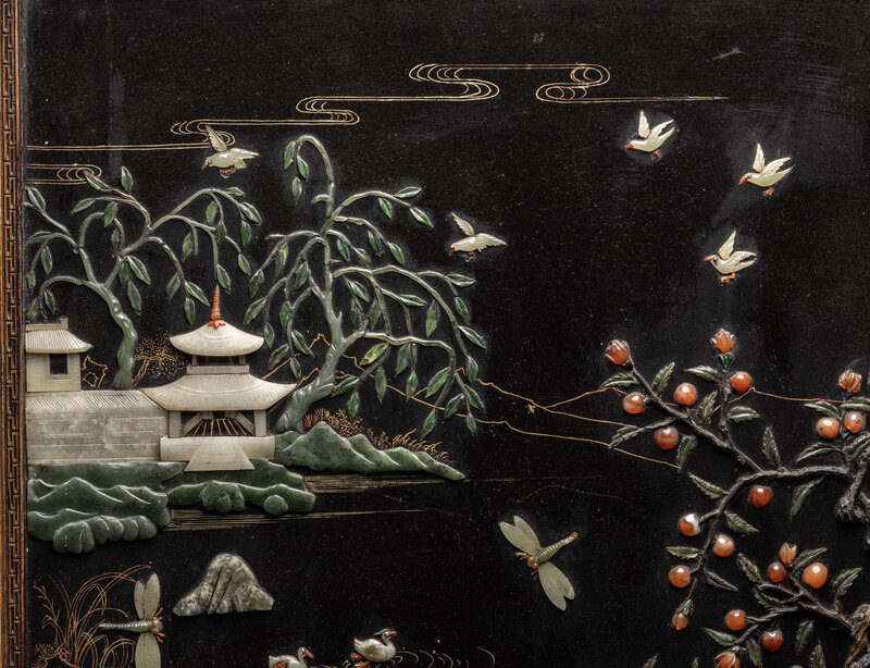 each rectangular section, set within a keyfret bordered metered frame suspended by ornate bronze ruyi-form hooks, worked with carved jade, lapis, agate stones, and gilt painted details to show fruiting trees, swallows, lotus fields, scholars and boys, and rockery.